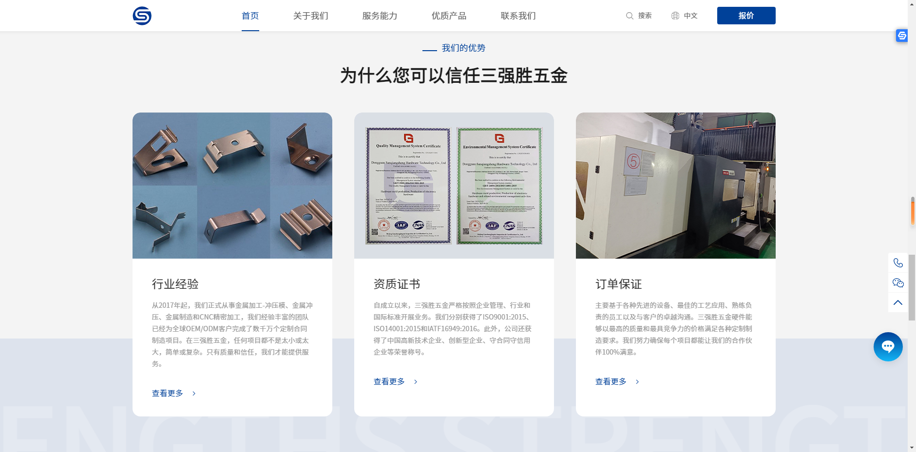 東莞市三強勝五金科技有限公司((簡稱三強勝五金或三強勝),一直致力于為各類 OEM/ODM客戶如汽車、通訊、電子、家電、醫(yī)療等提供高、精、專全方位高規(guī)格高性價比定制制造服務(wù)。
